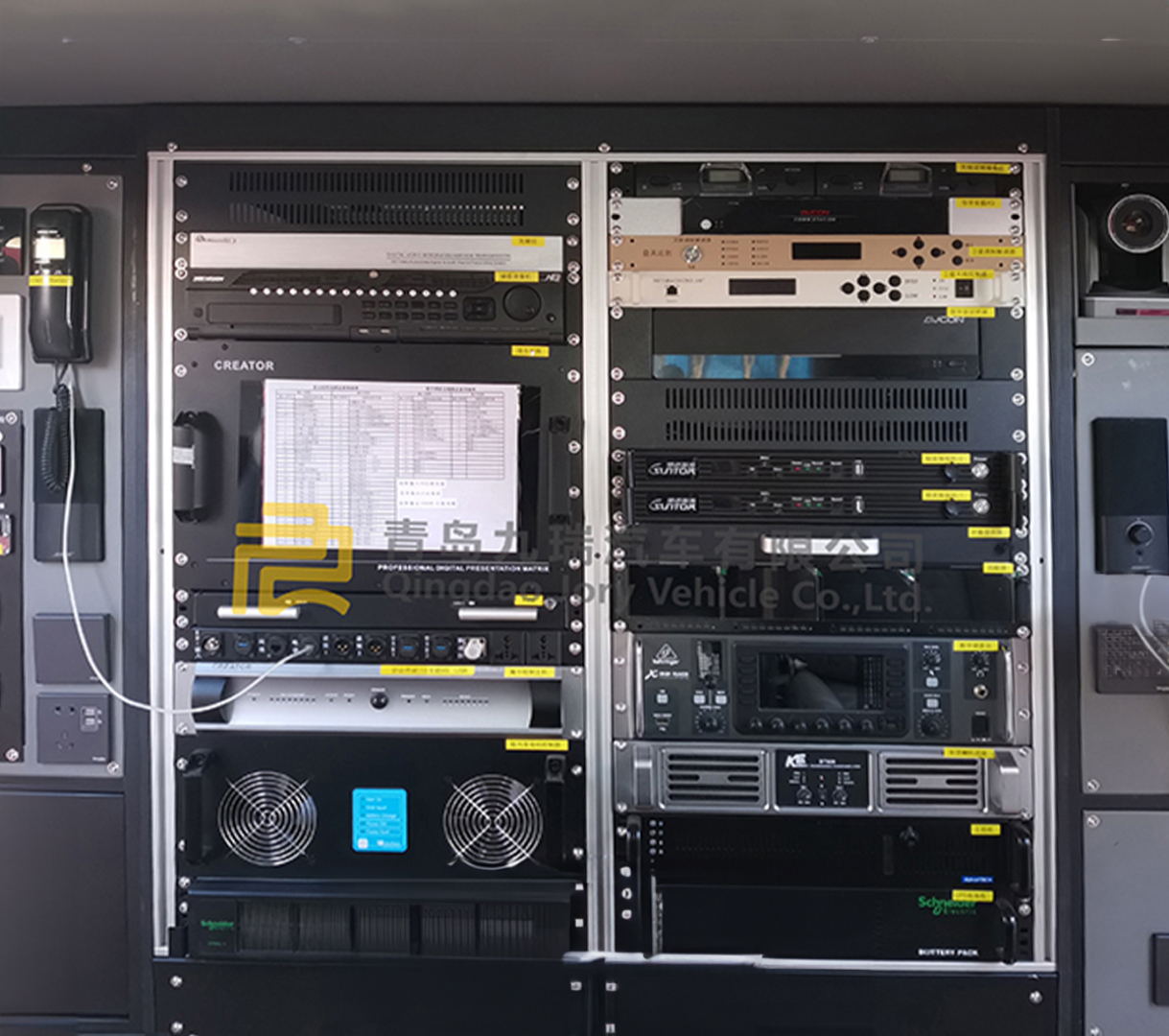 九瑞牌福特F550通信指揮車車內(nèi)平臺按功能分為三段,前部駕駛艙、中部操作艙、后部設(shè)備艙;操作艙設(shè)有兩個可旋轉(zhuǎn)座椅,方便進行通信設(shè)備操作;后部設(shè)備艙可配備電纜盤、發(fā)電機控制單元、UPS主機、蓄電池、雜物柜,設(shè)備配重布局合理,安裝平衡穩(wěn)固。